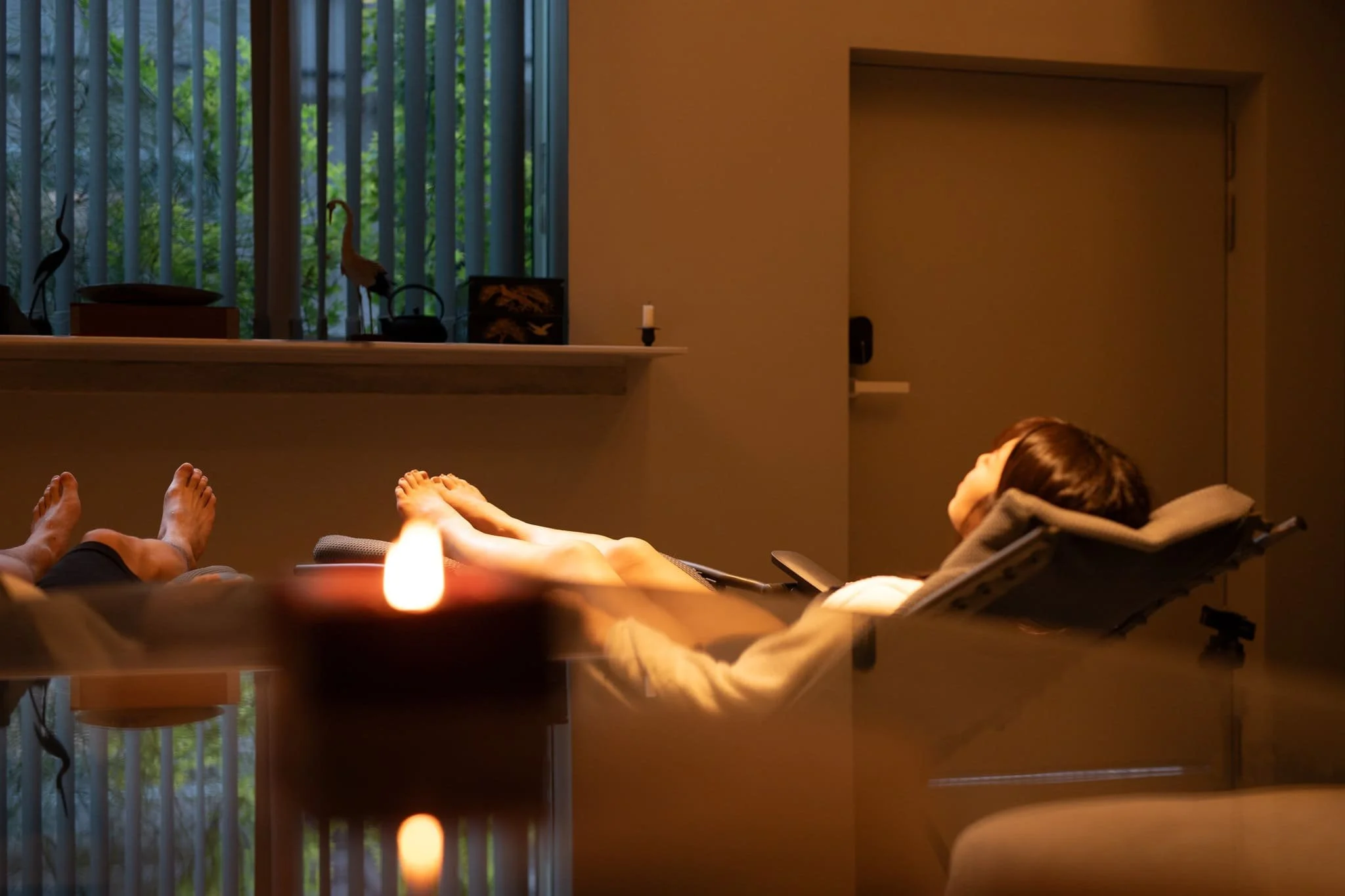 奈良・吉野産のヒノキを用い、丁寧に仕上げた無塗装のベンチを設置。木の香りと静寂に包まれたプライベート空間は、まさに瞑想のためのサウナです。定期的に木肌を削り出すメンテナンスを行うことで、いつまでも新鮮な香りをお楽しみいただけます。窓辺には障子調の意匠を施し、都会にいながら和の趣と非日常感をご体験いただけます。